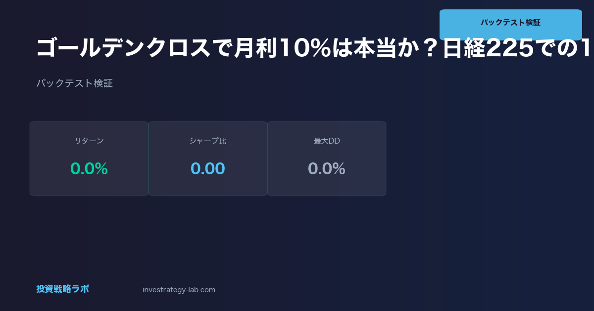 SNSで「ゴールデンクロスで月利10%」という投資情報を見かけたことはありませんか?移動平均線の交差を狙った手法は、テクニカル分析の中でも特に人気があります。しかし、YouTubeやTwitterで見かける主張と、実際の市場での成績は大きく異なることも多いです。投資戦略ラボでは、このゴールデンクロス戦略を実際にバックテストして、客観的なデータを集めてみました。