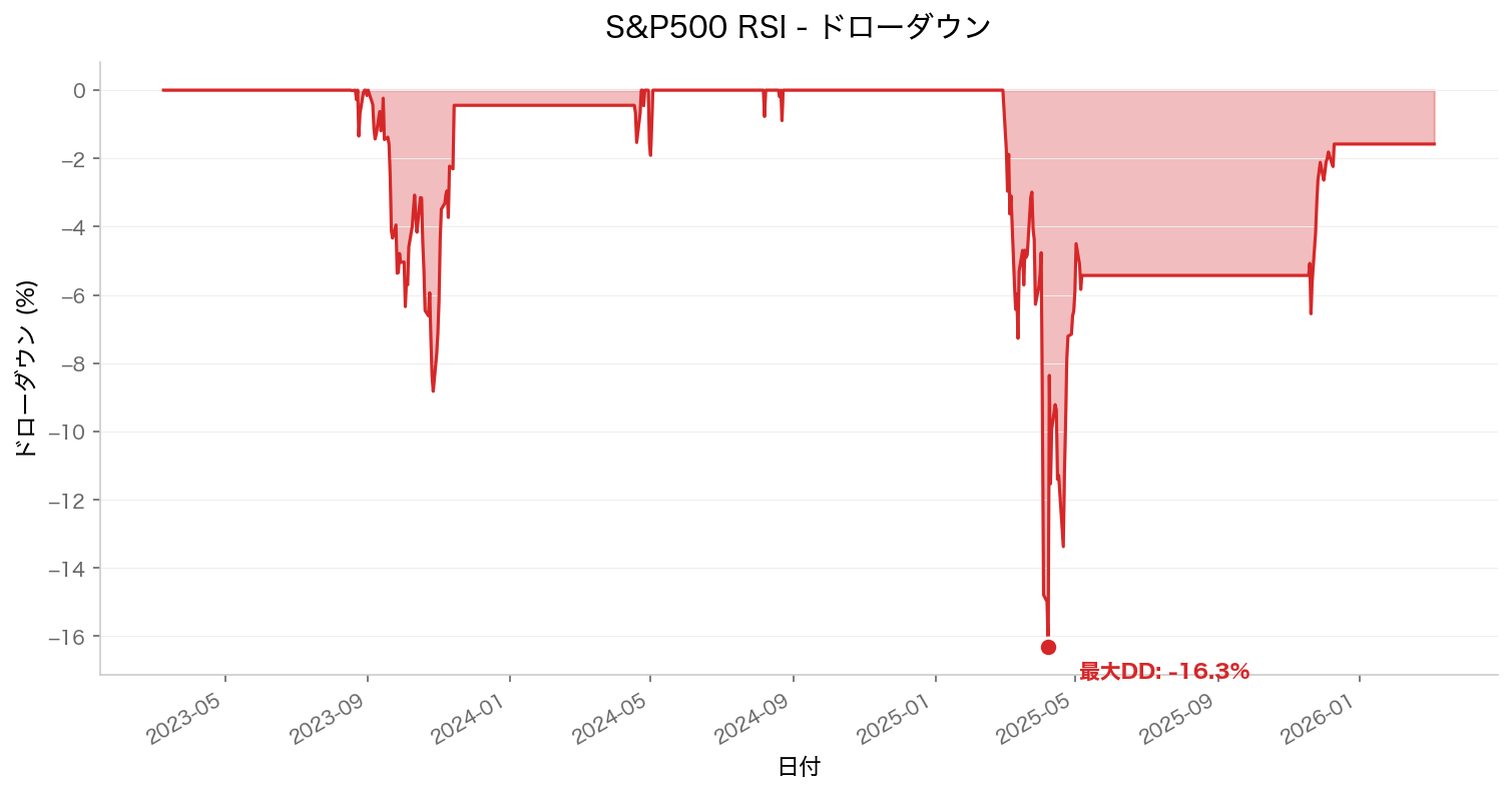 このグラフの見方:赤色の領域が、ピークからの下落率を示しています。RSI戦略の最大ドローダウンは16.32%で、Buy & Holdの20~25%と比べると、確かに下落幅が小さいです。