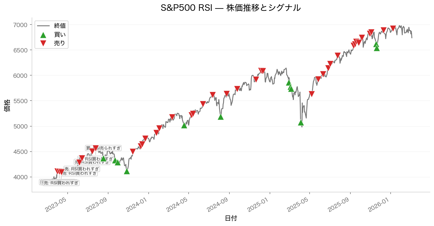 このグラフの見方:青い線がS&P500の株価推移、緑色の▲マークが買いシグナル(RSI < 30)、赤色の▼マークが売りシグナル(RSI > 70)を示しています。売買頻度は想像以上に低く、検証期間中にわずか5回の取引に留まりました。